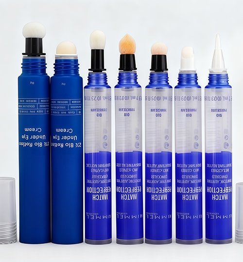 Tubes with valves or twist mechanisms for precise control. Options include flocking heads and sponge tips for diverse makeup application.