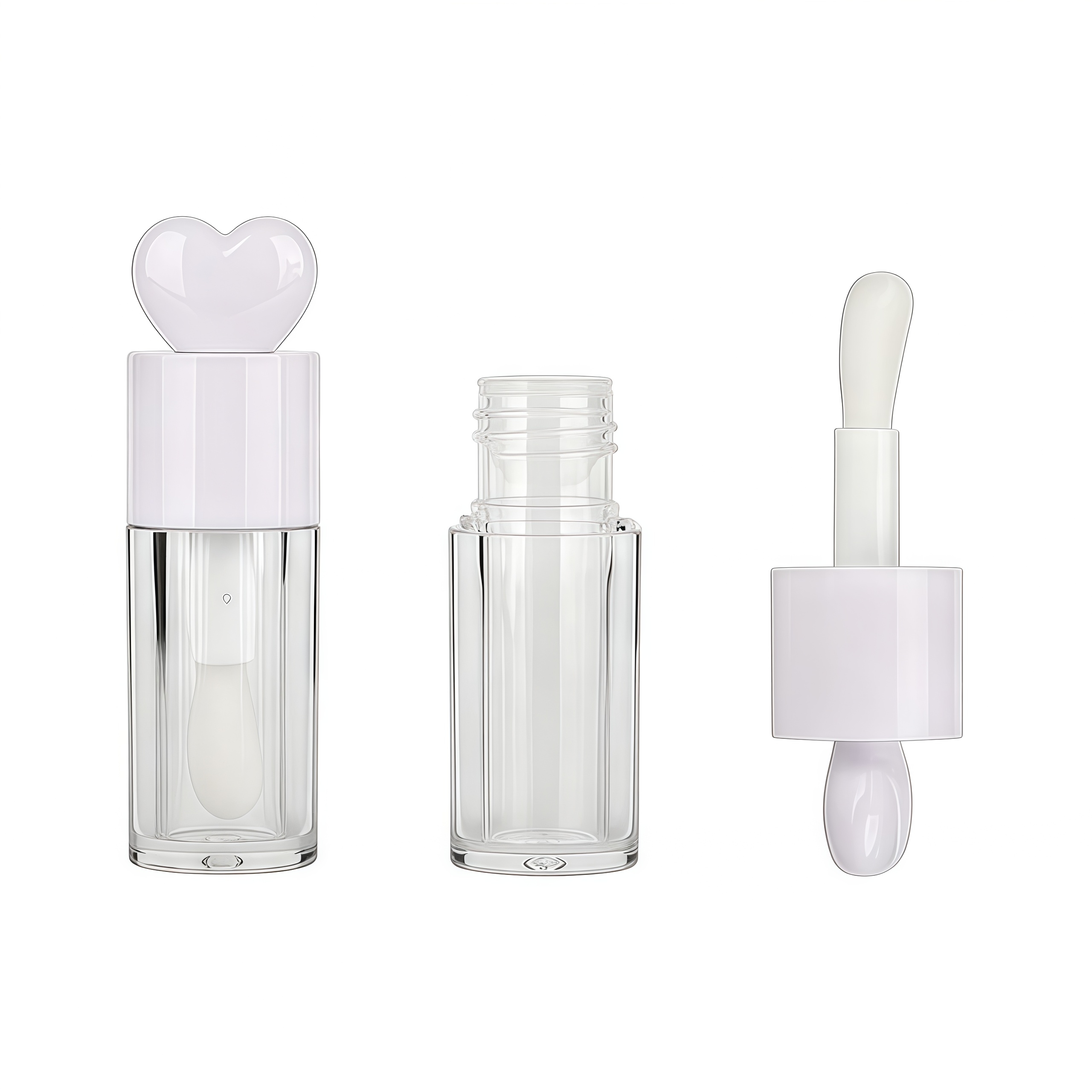 This gloss tube charms with its distinctive heart-shaped cap in soft lilac-pink, paired with a clear cylindrical body. Its integrated velvet flocked brush allows for precise, gentle application, and is available in multiple portable sizes with customizable brush options.