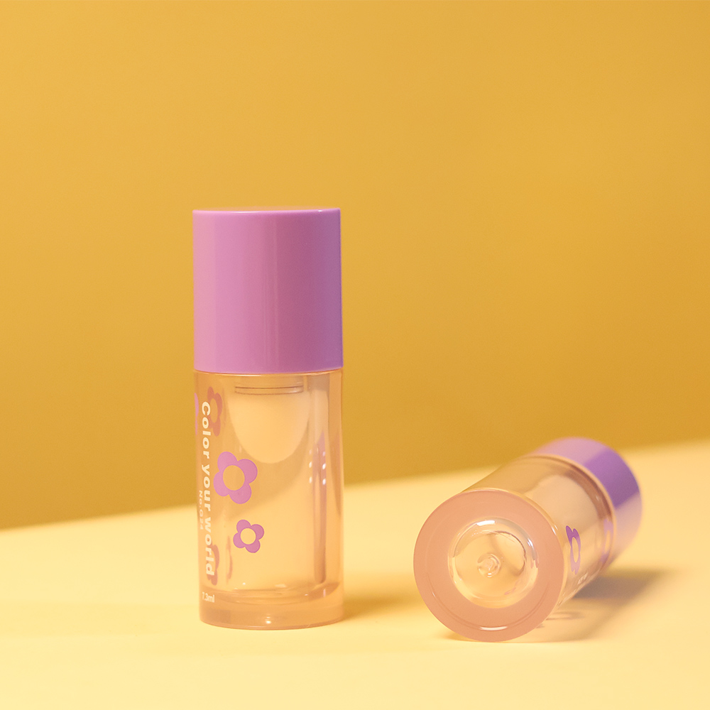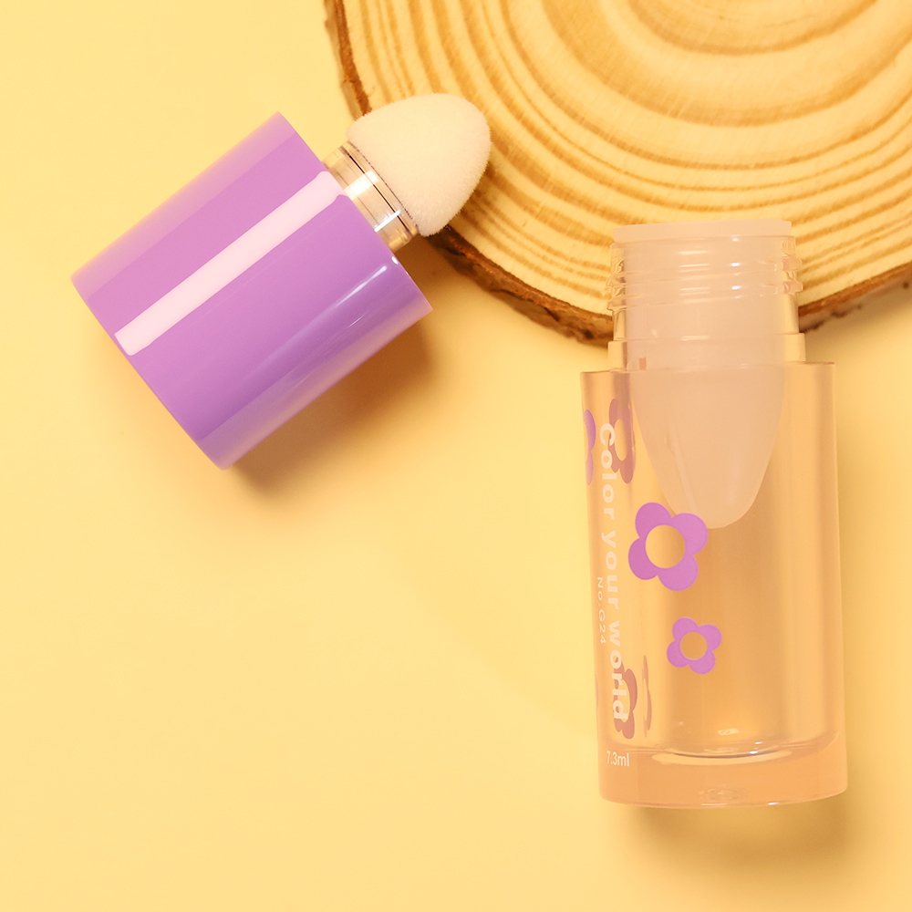 This 7ml tube features a plump, short cylindrical silhouette with a 2:1 cap-to-body ratio, pairing a clear AS body printed with delicate purple flowers with a glossy purple ABS cap. The soft white mushroom-shaped flocked applicator adds a charming, cushiony touch. Every element—from pattern to brush head and logo—is fully customizable to your brand.